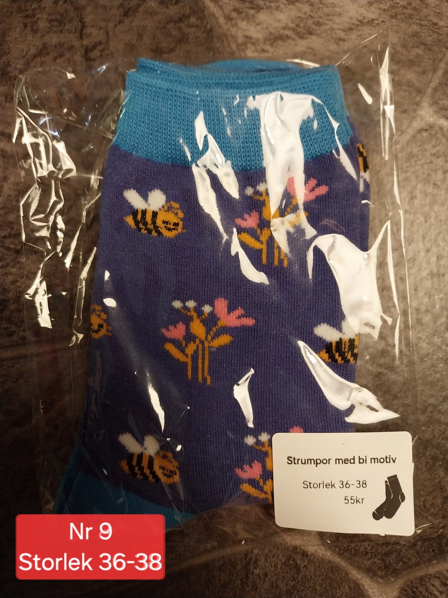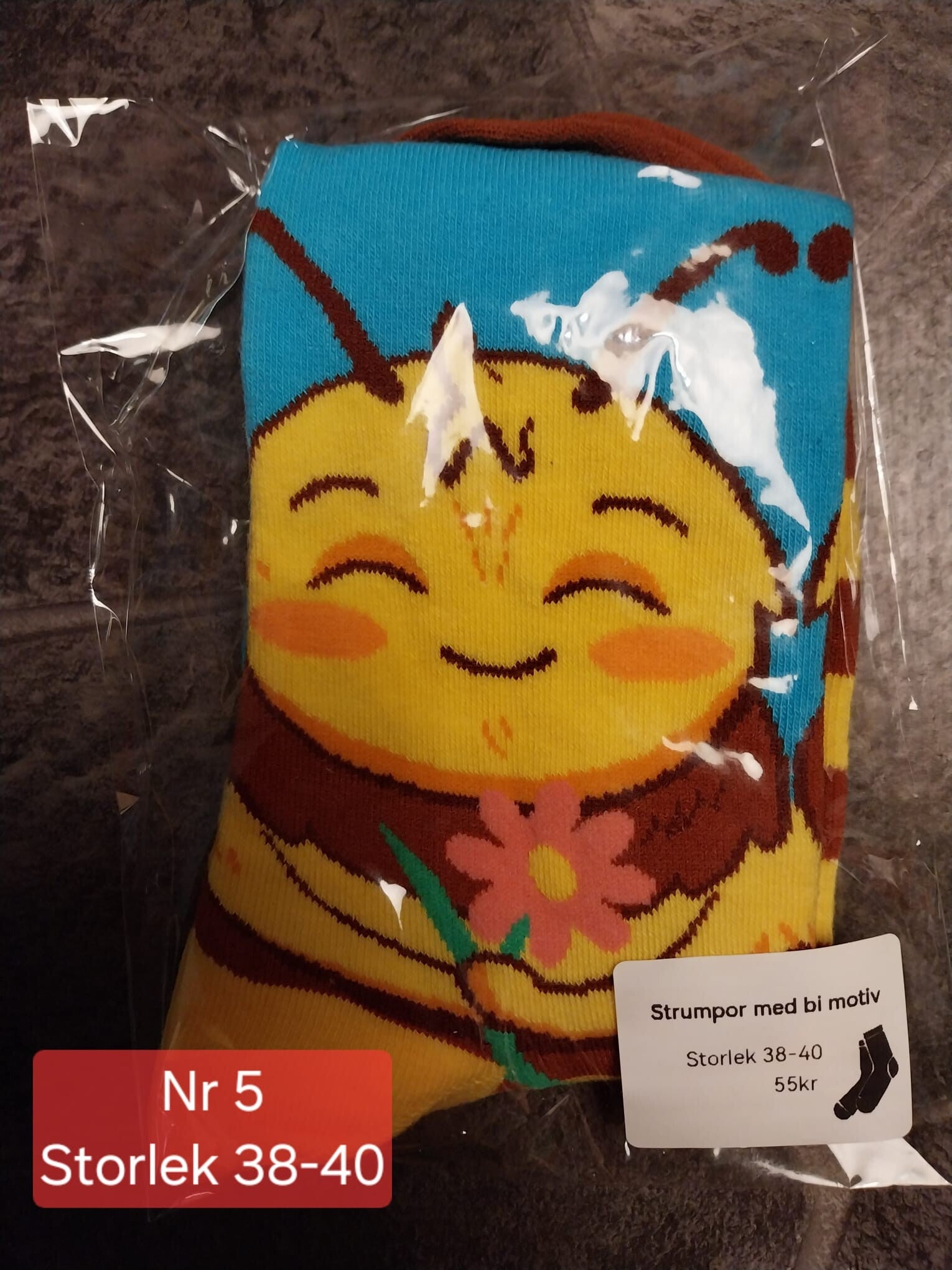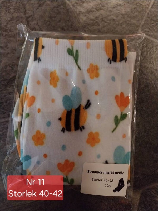 Strumpor med bi motiv i olika storlekar.